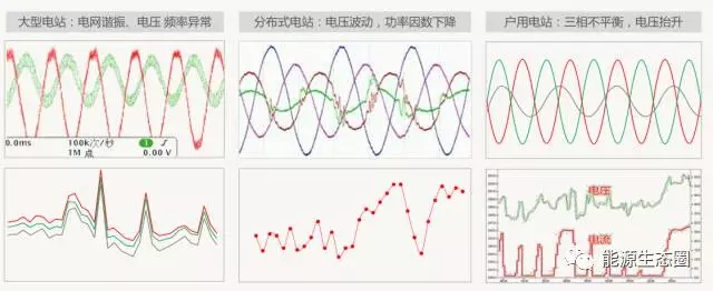 當(dāng)然,隨著光伏風(fēng)電等新能源的接入,由于電網(wǎng)環(huán)境會日益復(fù)雜化。大家可以從上圖中看出,隨著分布式高滲透率的接入,會造成一些大型電站出現(xiàn)電網(wǎng)的諧震、電壓頻率的異常;分布式電站會出現(xiàn)一些電壓的波動、功率因素下降;互用電站會出現(xiàn)一些三相不平衡,電壓抬升等一些現(xiàn)象。