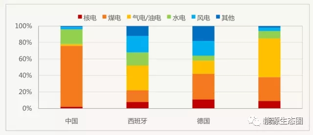 從這張圖中可以看出,我們中國的電源結(jié)構(gòu)是很不合理的。在西班牙、德國和美國,他們從核電、煤電、氣電、油電、水電到風(fēng)電的分配比例還是比較合理的。但在中國,煤電占據(jù)了大部分,風(fēng)電和太陽能占據(jù)很少。