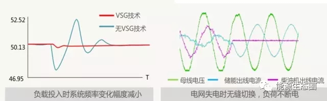 基于虛擬同步發(fā)電機(jī)技術(shù)的光儲系統(tǒng)能夠增強(qiáng)局域電網(wǎng)的慣性,同時,逆變器實現(xiàn)如同步發(fā)電機(jī)類似的一次調(diào)頻和二次調(diào)頻,抑制負(fù)載投切引起的電壓/頻率波動,改善微網(wǎng)電能質(zhì)量,同時,通過VSG這種外特性曲線,實現(xiàn)以電壓源形式、燃?xì)廨啓C(jī)、柴油機(jī)、電網(wǎng)連接,實現(xiàn)供電的無縫切換。下圖可以看出有VSG技術(shù)和無VSG技術(shù)的一些對比: