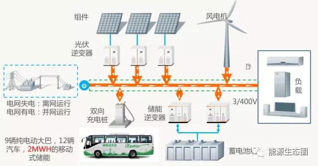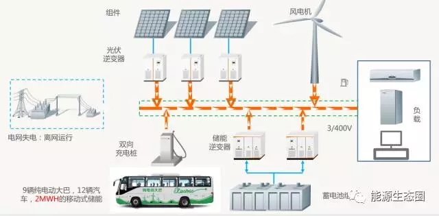 同時可以在微電網(wǎng)的離網(wǎng)模式下,可以將園區(qū)或企業(yè)的電動大巴、電動汽車作為后備儲能系統(tǒng),通過所謂的雙向充電樁功能,可將電動大巴車的能量釋放到電網(wǎng)中間,或者將電動大巴能量通過能量綜合站收集起來,歸整個園區(qū)能量進(jìn)行調(diào)配、使用。