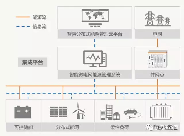 下圖是光伏+儲能的深度融合構(gòu)建,可以為我們的智能微電網(wǎng)增加一些用能的可靠性。通過我們的這種集成平臺、智慧分布式能源管理云平臺以及智能微電網(wǎng)能源管理系統(tǒng),實現(xiàn)可控儲能、分布式能源,柔性負(fù)荷、配電設(shè)備。