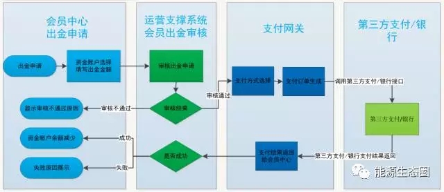 關(guān)于這個綠色電力交易平臺的交易和支付流程如上圖所示,通過會員中心出金申請到運(yùn)營支撐系統(tǒng)會員出金審核到支付網(wǎng)關(guān)來形成支付訂單到通過第三方支付或者銀行交易平臺來實現(xiàn)交易。同時,通過這四個方面,再通過一個閉環(huán)回歸能夠達(dá)到真正地實現(xiàn)交易和支付流程的全部完結(jié)過程。