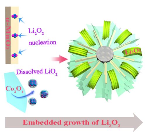 中國儲能網(wǎng)訊:鋰空氣電池因具有超高的理論能量密度而被認為是電動汽車的潛在動力電源。鋰氧電池的放電產物過氧化鋰(Li2O2)具有絕緣、不溶的特性,因此,隨著放電的進行,電極表面會逐漸被其鈍化而導致放電終止。大尺寸Li2O2的生成有助于延緩正極表面的鈍化、延長放電時間、提高電池容量。然而,大尺寸Li2O2在電極表面往往隨機散落,難以保證其與電極材料之間的有效接觸,從而限制了電池的倍率性能和能量效率。因此,亟需實現(xiàn)大尺寸Li2O2在電極材料中的嵌入式生長。