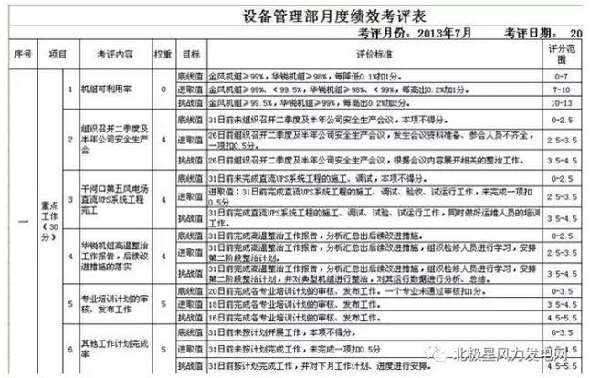工作業(yè)績按照部門、班組、個人進行三級考評,月初由部門、班組、個人各自完成三級績效考評項目的申報,申報的依據(jù):部門績效考評項目按照公司月度工作計劃進行編制;班組績效考評項目按照部門月度工作計劃進行編制;個人績效考評項目按照班組月度工作計劃進行編制,按照自上而下管理的原則進行管理。工作業(yè)績的考評按照百分制進行,其中月度重點工作所占比重為30%,KPI關(guān)鍵績效指標所占比重為50%,基礎(chǔ)指標所占比重為20%。下面就以風電場設(shè)備管理部、檢修班組以及檢修員月度績效考評內(nèi)容為例。