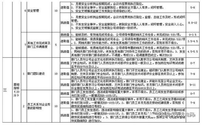 為了使員工的工作業(yè)績達到“跳起來摘桃子”的效果,通過對工作內(nèi)容的充分定位、定量,創(chuàng)新開展了以底線值為基礎(chǔ),進取值為升華,挑戰(zhàn)值為突破的管理模式。進取值、挑戰(zhàn)值的方向則按照工作內(nèi)容的不同量身制定,既要體現(xiàn)出該指標三個值的的差距,同時也要考慮該值的可完成性,避免出現(xiàn)望塵莫及,打擊員工工作的積極性。具體內(nèi)容,見各考評表。