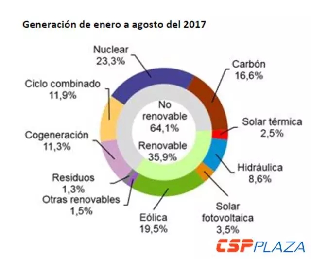 截止目前,2017年西班牙光熱發(fā)電量占總發(fā)電量的2.5%,而核電、風(fēng)電、煤電、聯(lián)合循環(huán)發(fā)電量分別占總發(fā)電量的23.3%、19.5%、16.6%與11.9%;熱電聯(lián)產(chǎn)、水電、光伏發(fā)電量則分別占總發(fā)電量的11.3%、8.6%與3.5%。(見下圖)