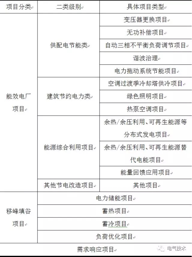 我國(guó)《電力需求側(cè)管理城市綜合試點(diǎn)項(xiàng)目類型及計(jì)算方法(試行)》將電力需求側(cè)管理項(xiàng)目分為能效電廠、移峰填谷和需求響應(yīng)三大類。具體項(xiàng)目見下表。