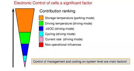 大陸給出的電動車用電池老化影響因子貢獻分布圖,可以看出,HEV/EV電池系統(tǒng),儲存溫度對電池壽命影響比重最大,其次是行駛過程溫度,二者分別為電池日歷壽命及循環(huán)壽命主要影響因子,相比之下DOD排在第三,其主要影響電池循環(huán)壽命。