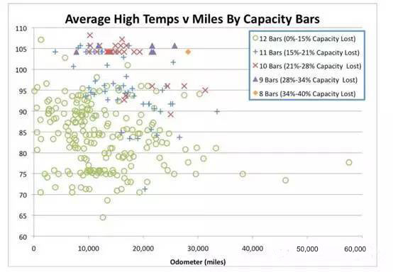 這張圖顯示了288輛2011款Leaf車型在美國不同地區(qū),不同工況里程數(shù)下的容量衰減情況,粗略的看,電池系統(tǒng)容量衰減還是比較快的,不是一個令人滿意的結(jié)果,當然這是日產(chǎn)Leaf 2011年的車型,整個電池系統(tǒng)采用的是自然冷卻的方式,新的日產(chǎn)Leaf進行了技術(shù)更新。