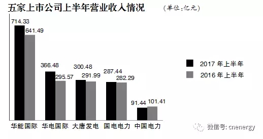 業(yè)績(jī)報(bào)告顯示,除中國(guó)電力外,其余四家公司上半年?duì)I業(yè)收入均較去年同期有不同幅度的增長(zhǎng),華電國(guó)際延續(xù)了去年?duì)I收第二的地位并進(jìn)一步擴(kuò)大優(yōu)勢(shì),營(yíng)收同比增幅達(dá)23.99%,增速在五家公司中居首位。