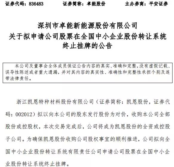 中國(guó)儲(chǔ)能網(wǎng)訊:卓能股份(836483)9月1日公告稱(chēng),浙江凱恩特種材料股份有限公司(證券簡(jiǎn)稱(chēng):凱恩股份,證券代碼:002012)擬以向公司的股東發(fā)行股份為對(duì)價(jià),收購(gòu)公司全部股份或控股權(quán),本次交易完成后,公司將成為凱恩股份的全資或控股子公司。為確保凱恩股份收購(gòu)公司股權(quán)事宜的順利推進(jìn),公司擬向全國(guó)中小企業(yè)股份轉(zhuǎn)讓系統(tǒng)有限責(zé)任公司申請(qǐng)公司股票在全國(guó)中小企業(yè)股份轉(zhuǎn)讓系統(tǒng)終止掛牌。