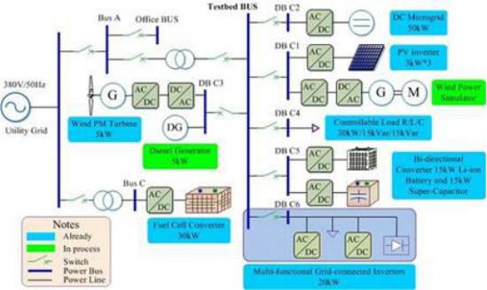 分布式能源(DER):一般定義為包括分布式發(fā)電(DG)、儲(chǔ)能裝置(ES)和與公共電網(wǎng)相連的系統(tǒng)。其中DG是指滿足終端用戶的特殊需求,接在用戶側(cè)的小型發(fā)電系統(tǒng),主要有內(nèi)燃機(jī),微型燃?xì)廨啓C(jī)、燃料電池、太陽能、風(fēng)能等發(fā)電;
