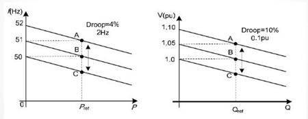 下垂控制:即選擇與傳統(tǒng)發(fā)電機(jī)相似的頻率一次下垂特性曲線(DroopCharacter)作為控制方式,即分別通過P/f下垂控制和Q/V下垂控制來獲取穩(wěn)定的頻率和電壓,這種控制方法對(duì)微網(wǎng)中的微源輸出的有功功率和無功功率分別進(jìn)行控制,無需機(jī)組間的通信協(xié)調(diào),實(shí)現(xiàn)了微源即插即用和對(duì)等控制的目標(biāo)。