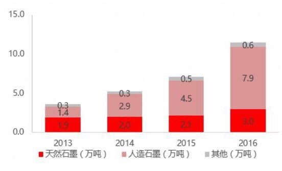 據(jù)前瞻產(chǎn)業(yè)研究院了解到,現(xiàn)在市場上的負(fù)極大部分被天然石墨壟斷,但是受制于上游價格,本人認(rèn)為,在性價比相同的情況下,人造石墨將有可能替代天然石墨。根據(jù)了解,人造石墨在市場中的份額不斷攀升,從2013年的1.4萬噸到2016年的7.9萬噸,增長率為464.28%。而相比之下,天然石墨的增長趨勢就不是很明顯,從2013年1.9萬噸到2016年的3.0萬噸,增長率僅為57.89%。