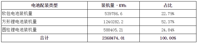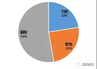 其中方形裝機量為560160.18KWh乘用車市場占比50%,軟包336193.25KWh乘用車市場占比30%,圓柱222416.54KWh乘用車市場占比20%