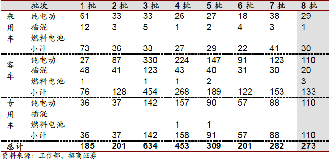 據(jù)了解,第8批推薦目錄共95家企業(yè)的273個車型入選,目前已發(fā)布的前8批目錄累計已超過去年全年水平,目錄的連續(xù)正常發(fā)布以及近期雙積分政策有望落地,新能源汽車市場有望再次加速。
