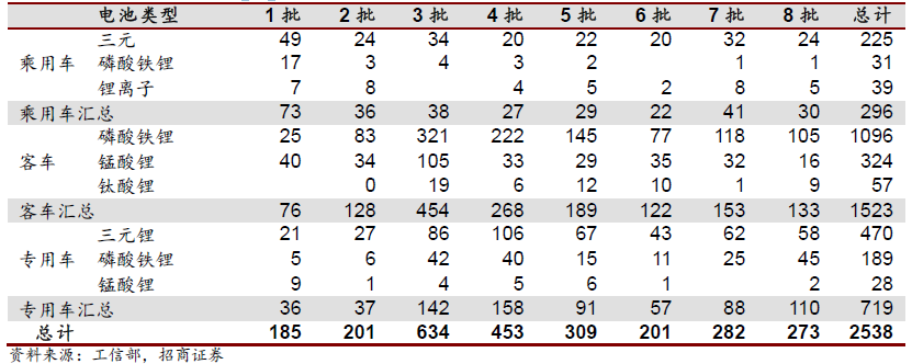 配套電池仍保持著高能量密度。從目前已經(jīng)披露的電池信息來看,本批乘用車/客車能量密度均值為125/117Wh/kg,整體與第6批水準(zhǔn)持平,較第7批略有下降,但仍顯著高于前5批的水準(zhǔn)。我們認(rèn)為這與磷酸鐵鋰占比上升相關(guān),電池高能量密度是大勢所趨,配套的正極、負(fù)極、電解液、隔膜、添加劑產(chǎn)業(yè)也面臨著機(jī)遇和挑戰(zhàn)。