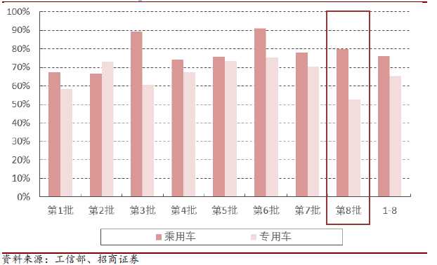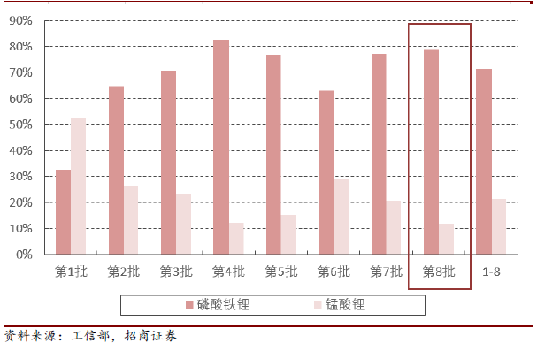 招商證券認(rèn)為,本批次乘用車與專用中,三元應(yīng)用比例分別為80%、53%,環(huán)比有所下滑,但仍保持著主流地位。磷酸鐵鋰保持著在客車中的絕對占比優(yōu)勢,同時專用車中磷酸鐵鋰的使用顯著增多,占比已由第7 批的28%提升至41%。