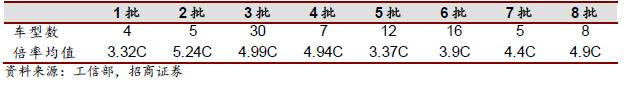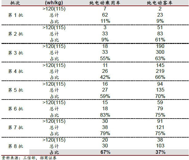 據(jù)調(diào)研,在第8批目錄中,符合1.2倍補(bǔ)貼要求的純電動乘用車比例為67%,較第6, 批有所下降,但是高于前5批的水準(zhǔn)??蛙囍懈吣芰棵芏鹊恼急认陆禐?7%,整體呈現(xiàn)向中密度集中的趨勢。