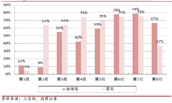 與之相反,客車持續(xù)著較低迷的表現(xiàn),共133 款,環(huán)比下降13%,占比49%。乘用車原本占比較小,本批次雖然下降27%,但仍有30 款車型,較為符合預(yù)期。因此就車型來看,后續(xù)專用車的持續(xù)放量值得關(guān)注。