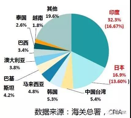 從圖中可以看出,印度、日本是兩個(gè)最大的出口國,占比達(dá)到50%。