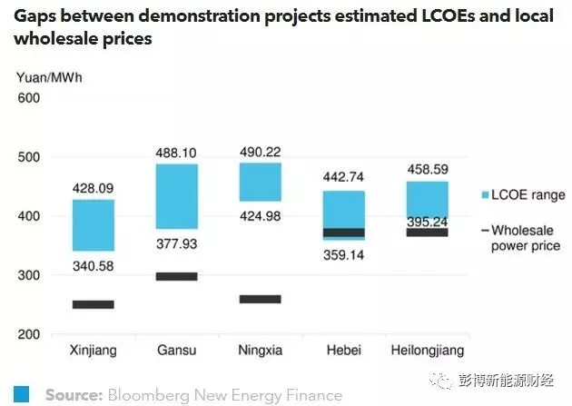 ? 彭博新能源財經(jīng)按照過去五年每省平均棄風率計算得出,冀北地區(qū)的示范項目可實現(xiàn)平價上網(wǎng),其余省份項目的平準化電力成本(LCOE)均高于標桿電價,但不排除優(yōu)質(zhì)項目大幅超過省平均利用小時數(shù),達到平價上網(wǎng)水平。