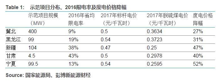 ? 13個示范項目集中在河北、黑龍江、甘肅、寧夏、新疆五個省份,棄風率相對較低的河北省將建設(shè)400MW,占示范總規(guī)模的57%。四個項目(共計198.5MW)早已于2014年前獲得項目批復(fù),但可能由于限電擔憂遲遲未開工。