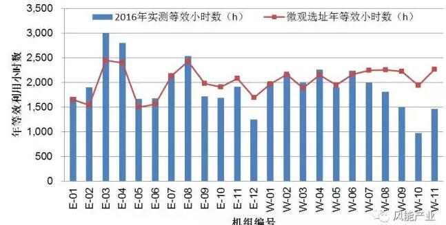 評估結(jié)果顯示,各機(jī)組2016年實測年等效利用小時數(shù)與微觀選址計算的年等效利用小時數(shù)對比如圖1所示。