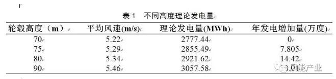 為論證W-10機(jī)組塔筒加高技改的可行性,采用激光雷達(dá)進(jìn)行為期75天的測風(fēng),測風(fēng)結(jié)果表明該機(jī)位處的風(fēng)切變?yōu)?.15?;谠摍C(jī)位的設(shè)計年平均風(fēng)速5.22m/s,結(jié)合實測風(fēng)切變,推算塔筒加高后,不同高度理論年發(fā)電量如表1所示。