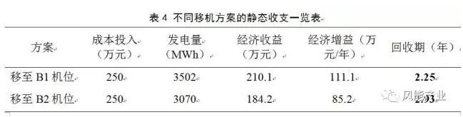 結(jié)合風(fēng)電場地形、道路和施工條件,在不考慮惡劣天氣無法施工和各種不可抗力的條件下,移機(jī)所需投入成本約為250萬元,主要包括:基礎(chǔ)及基礎(chǔ)環(huán)約50萬元,箱變基礎(chǔ)約50萬元、集電線路按一千米計算約50萬元,拆機(jī)、運輸、人工及吊裝費約100萬元。綜上所述,不同移機(jī)方案的收支表如表4所示。