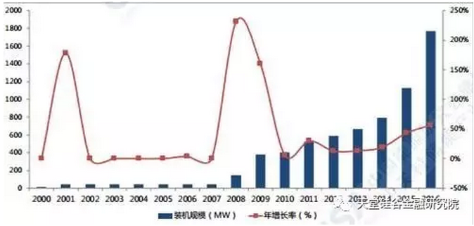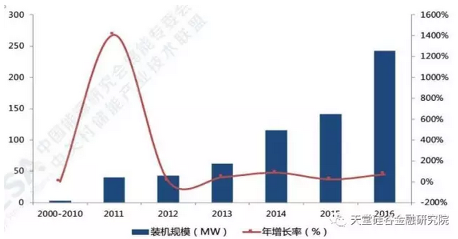 圖2:全球電化學(xué)儲(chǔ)能累計(jì)裝機(jī)規(guī)模(2000–2016)