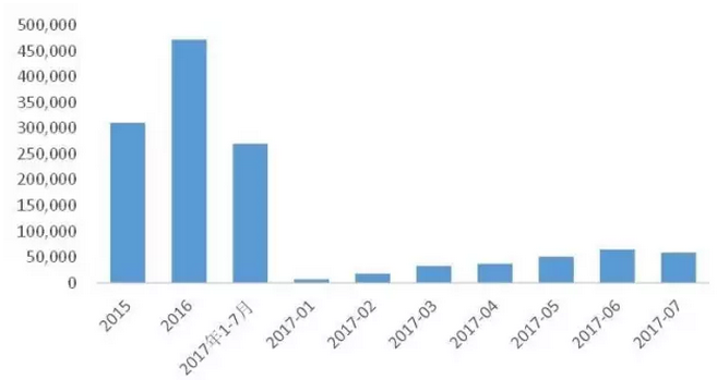 圖5:2015年–2017年前7個(gè)月我國(guó)新能源汽車(chē)產(chǎn)量