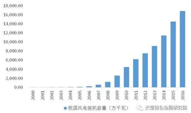 儲(chǔ)能的第三個(gè)應(yīng)用是在新能源發(fā)電領(lǐng)域,我國(guó)新能源電力主要是指光伏與風(fēng)電。在2000年之后,光伏以及風(fēng)電都經(jīng)歷一輪行業(yè)爆發(fā)性增長(zhǎng),截止2016年,光伏、風(fēng)電累計(jì)裝機(jī)容量分別為7742萬(wàn)千瓦(圖6)與1.69億千瓦(圖7)。