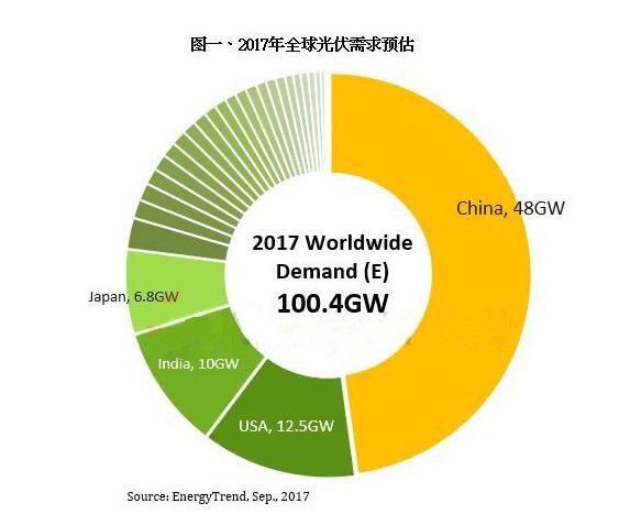 中國市場的爆量需求將推升2017年的全球安裝量來到100.4GW,再度刷新歷史新高。以安裝量來看,中國穩(wěn)居市場龍頭,美國以12.5GW、印度10GW以及日本6.8GW分居第二、三、四名,前四大市場將占全球75%以上需求。