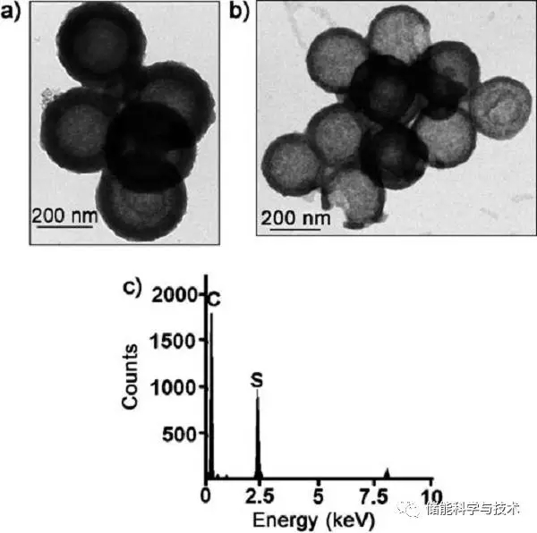 圖3 介孔碳空心球、碳-硫納米復(fù)合物的TEM圖及碳-硫納米復(fù)合物的EDX譜圖