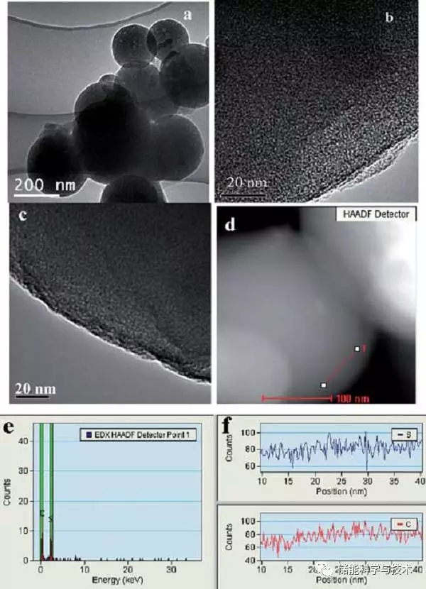 圖6 碳球與碳-硫復(fù)合物的TEM圖片、HAADF-STEM圖片、EDX譜圖