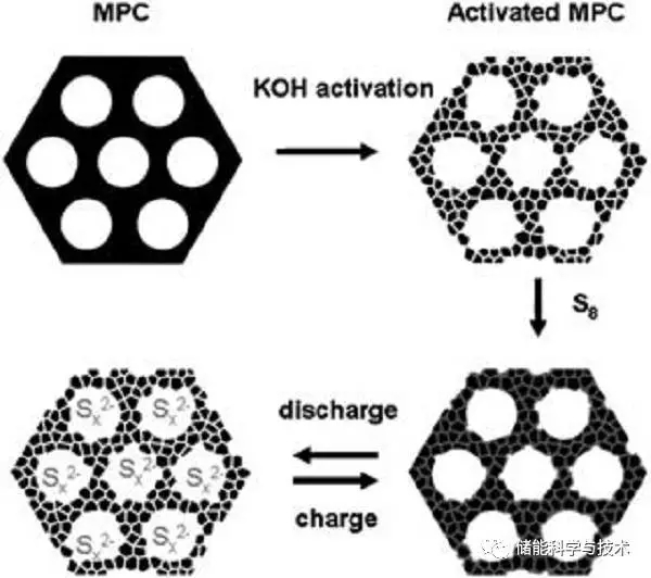 圖7 以雙峰多孔碳支撐的硫-碳復(fù)合正極材料的示意圖