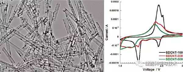 圖8 無序碳納米管的TEM圖及硫浸漬無序碳納米管電極第二次循環(huán)的CV曲線