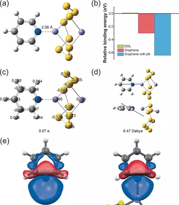 b)Li2S8和DOL、石墨烯或摻雜有吡啶氮(pN)的石墨烯之間的結(jié)合能;