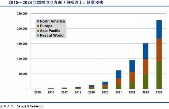 Navigant Research預(yù)測到2021年,全球燃料電池汽車(包括巴士)銷量將超過5萬輛,到2024年全球燃料電池車大規(guī)模量產(chǎn)時,年銷量將達到22.8萬輛。預(yù)計總市場規(guī)模將達到456億元。