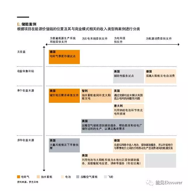 盡管目前市場環(huán)境對于儲能不利,儲能的市場潛力巨大,第一批實驗項目正在進行。羅蘭貝格分析了一些案例,并且根據(jù)這些項目在能源價值鏈所處位置以及商業(yè)模式的收入類型對這些案例進行了分類總結(jié)。