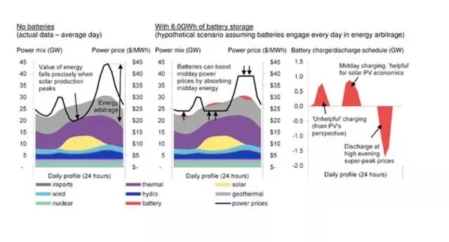 我們通常認為,電池與可再生能源之間存在高度共生關系,即電池將在有可再生能源電力產(chǎn)出的時段充電,并在其他時段放電。從多個層面來說,這種設計都非常合理。本質而言,電池可通過將低價值時段的可再生能源電力產(chǎn)出轉移至高價值時段,實現(xiàn)“能源套利”,從而降低電網(wǎng)的短期成本,并為可再生能源項目帶來收益。
