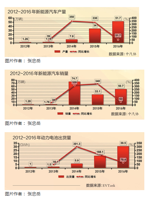 這五年,我國新能源汽車產(chǎn)業(yè)進(jìn)入黃金發(fā)展期。從2012年推廣應(yīng)用的1.7萬輛,提升到2013~2014年推廣應(yīng)用的10.1萬輛,2015年更是躍升至37.9萬輛,2016年突破50萬輛大關(guān),2015年以來,連續(xù)兩年產(chǎn)銷量居世界第一,累計推廣超過100萬輛,占全球市場保有量50%以上。2017年產(chǎn)銷量更有望突破70萬輛。