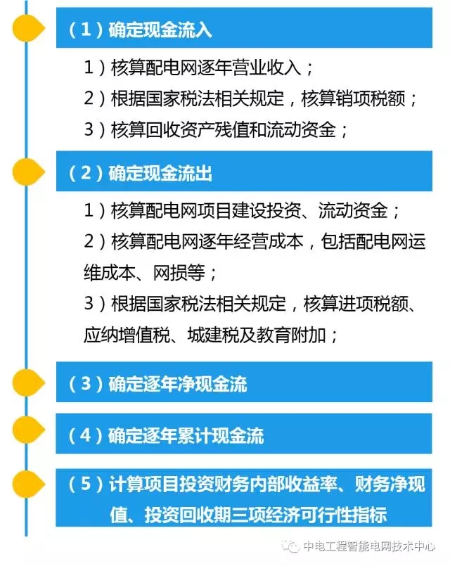 根據(jù)《關于建設項目經濟評價工作的若干規(guī)定》、《建設項目經濟評價方法》、《建設項目經濟評價參數(shù)》等國家頒布的相關規(guī)范文件,建設項目經濟評價包括財務評價和國民經濟評價兩部分。由于增量配電網屬于國家政策鼓勵的基礎設施建設項目,其國民經濟評價一般都是可行的,因此增量配電網經濟評價工作的重點在項目財務評價。而一個完整的財務評價包括盈利能力、償債能力和財務生存能力分析,涉及大量的評價指標和表格,評價工作需要專業(yè)機構來完成。