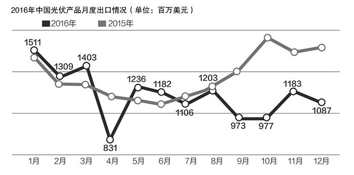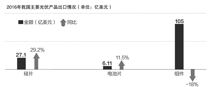 中國(guó)光伏協(xié)會(huì)公布的數(shù)據(jù)顯示,2016年全年,我國(guó)光伏產(chǎn)品出口總額為140億美元,同比下降10.4%。其中,硅片出口額27.1億美元,同比增長(zhǎng)29.2%;電池片出口額8.1億美元,同比增長(zhǎng)11.5%;組件出口額105億美元,同比下降18%。