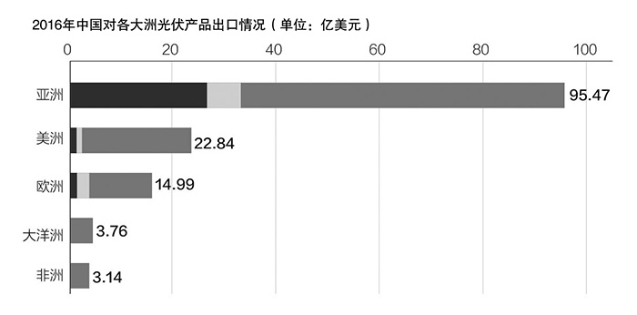 據(jù)統(tǒng)計(jì),2016年,中國(guó)硅片、電池片和組件產(chǎn)品出口額約為138.4億美元,同比下降11.3%;對(duì)印度、土耳其、智利、巴基斯坦等新興市場(chǎng)出口顯著提升,對(duì)歐美傳統(tǒng)市場(chǎng)出口占比下降幅度達(dá)到30%。