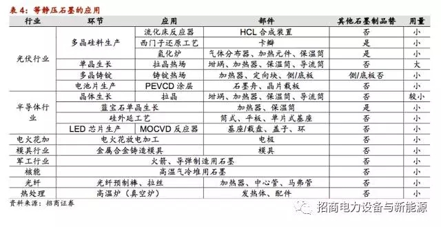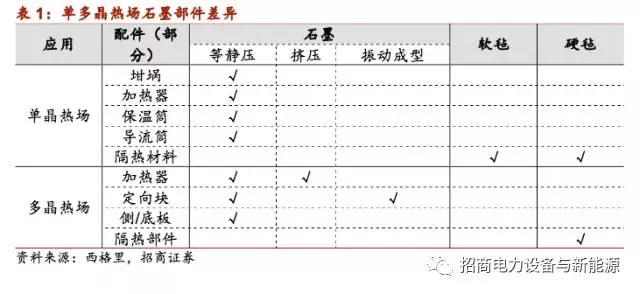單晶熱場(chǎng)石墨配件的原材料等靜壓石墨不可用其他石墨材料替換:從下表可以看出,單晶長晶熱場(chǎng)的坩堝、加熱器、保溫筒等主要配件無法用其他較低品質(zhì)的石墨制品代替,而多晶熱場(chǎng)的加熱器、定向塊雖然也需要等靜壓石墨,但也可也能夠擠壓或震動(dòng)成型石墨這些石墨代替。
