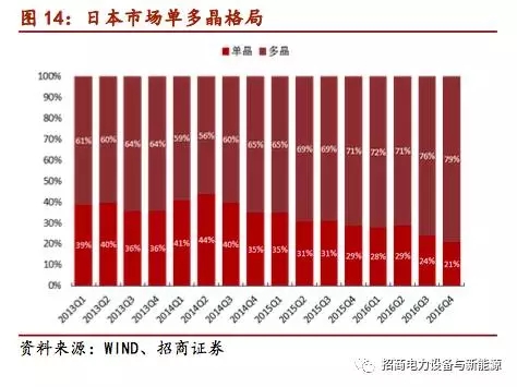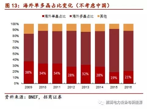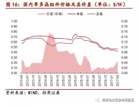 國內(nèi)價(jià)差縮小,推動(dòng)單晶滲透率不斷提升:國內(nèi)裝機(jī)2014年開始應(yīng)用單晶組件,2015年與2016年由于隆基股份單晶硅片成本迅速下降,單晶組件價(jià)格僅高于多晶組件0.1元/瓦,所以單晶組件在國內(nèi)占比迅速由5%上升至27%,預(yù)計(jì)今年國內(nèi)單晶組件占比將上升至35%。