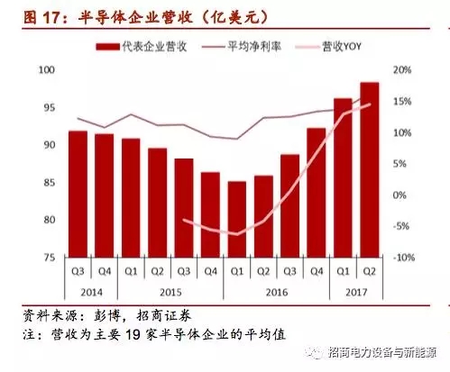 上半年半導(dǎo)體價(jià)格上漲帶動(dòng)企業(yè)營收上漲:由于上半年半導(dǎo)體產(chǎn)品價(jià)格普遍上揚(yáng),如快閃儲(chǔ)存器價(jià)格從2016年下半年起上漲達(dá)11.6%、PCDRAM合約均價(jià)從2016年一季度至今漲幅逼近40%,因此半導(dǎo)體各企業(yè)的營收相比此前有較大幅度上升,就統(tǒng)計(jì)主要企業(yè)的營收來看同比增速達(dá)到15%,環(huán)比增速也達(dá)到2%。