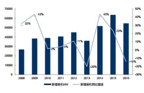 綜合國內(nèi)外的數(shù)據(jù)來看, 截至 2016 年,我國風(fēng)電新增裝機(jī)達(dá)約占全球風(fēng)電市場(chǎng)份額的42.7%,以絕對(duì)優(yōu)勢(shì)領(lǐng)跑全球風(fēng)電市場(chǎng)。而 2016 年國內(nèi)市場(chǎng)經(jīng)歷了風(fēng)電搶裝后的回調(diào), 同時(shí)疊加電力需求下降和電網(wǎng)消納風(fēng)電能力不足, 導(dǎo)致國內(nèi)市場(chǎng)的裝機(jī)容量明顯下滑,進(jìn)而全球市場(chǎng)風(fēng)電新增裝機(jī)容量隨之下滑。